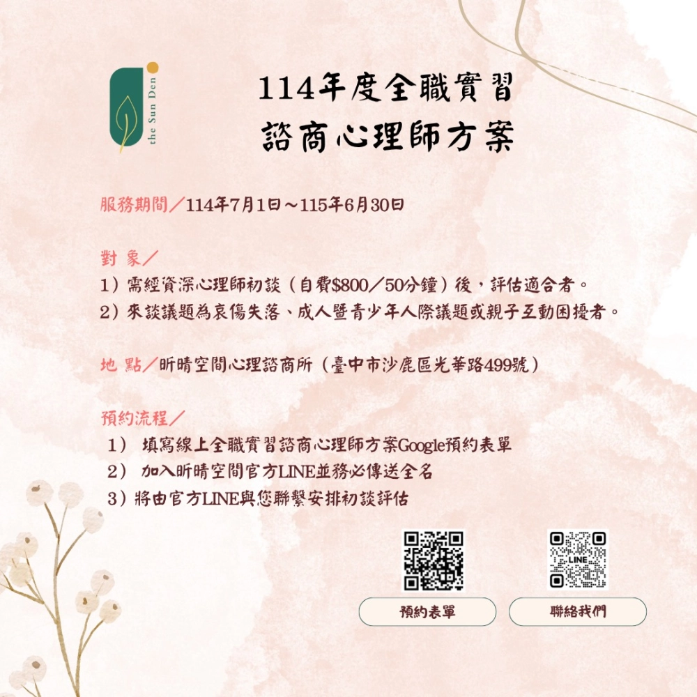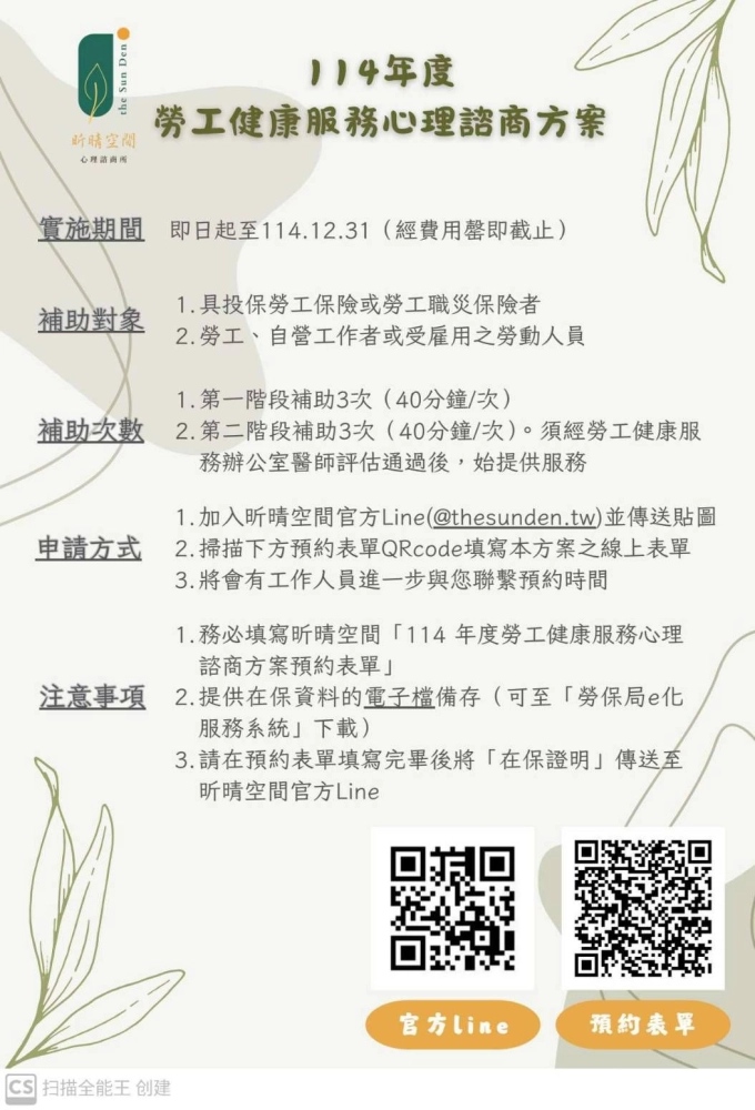 原定至114/12/31的勞工局心理諮商方案,因勞工局經費用罄,服務將於114/9/30 暫告一段落,感謝民眾的配合與支持!